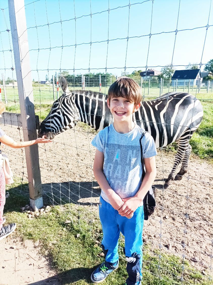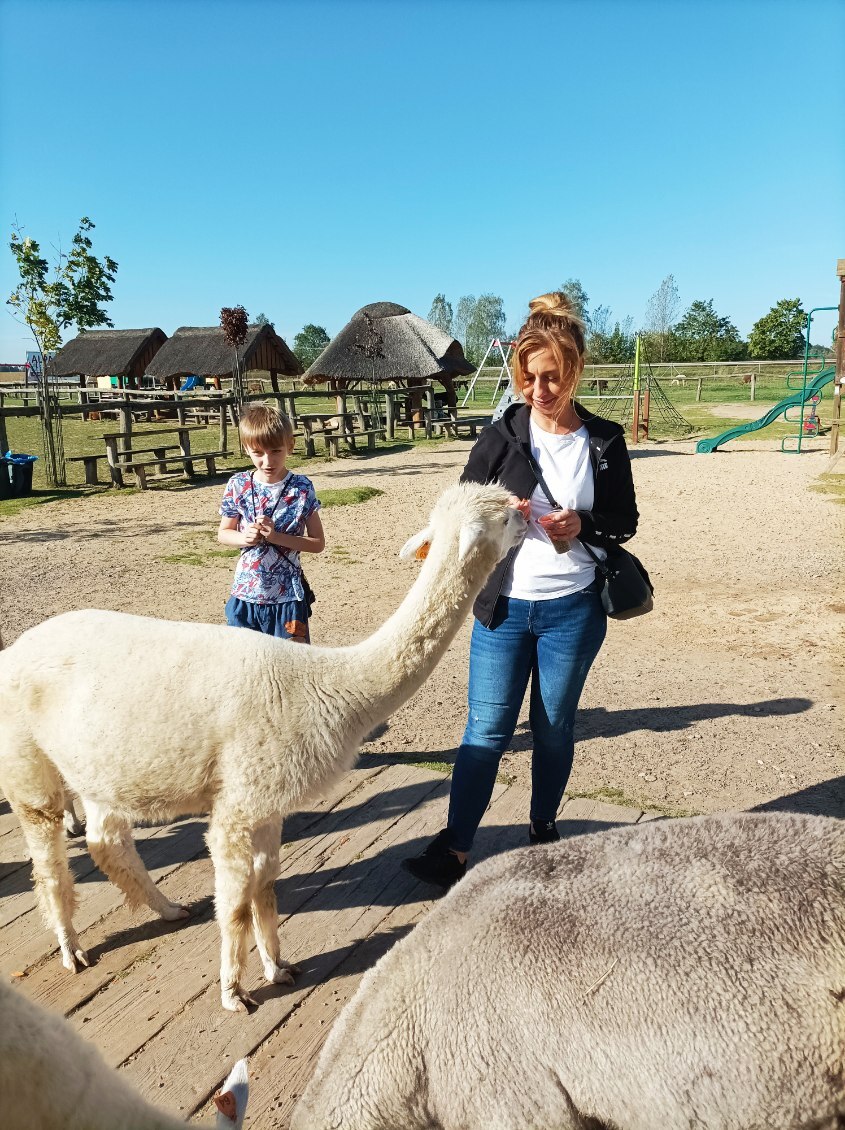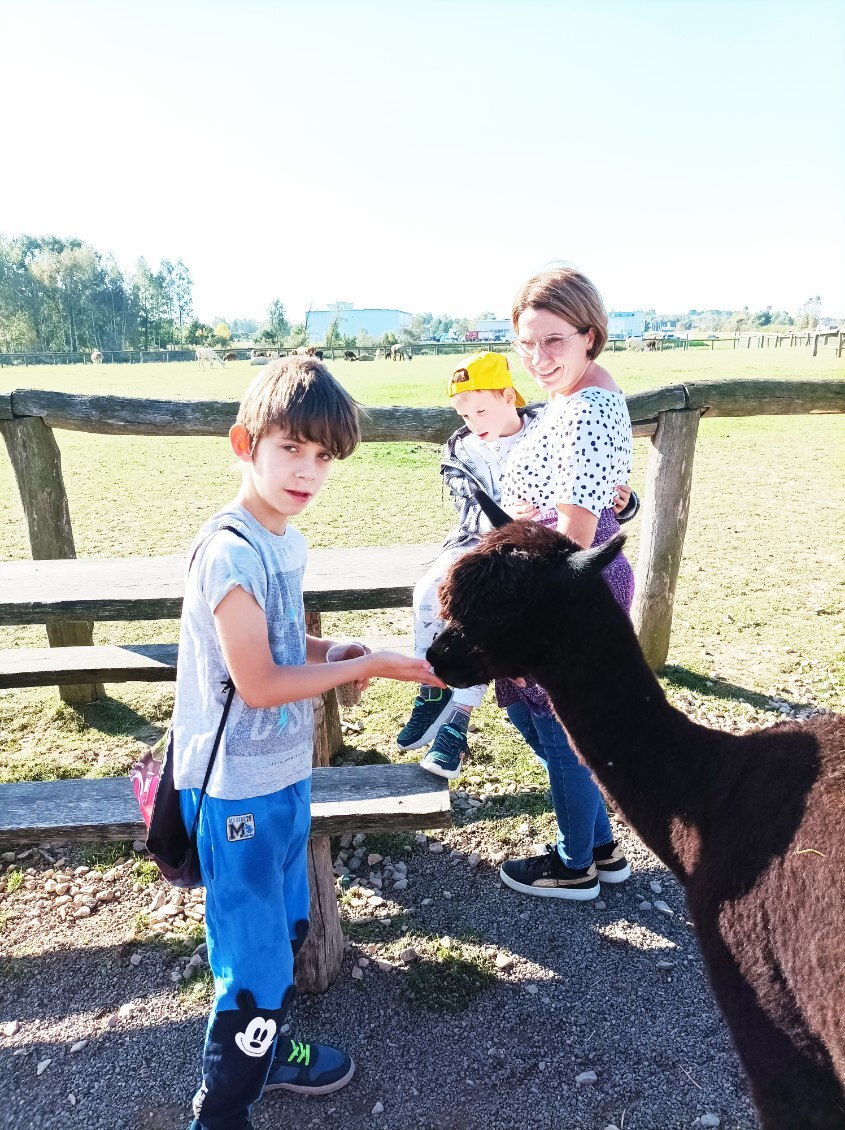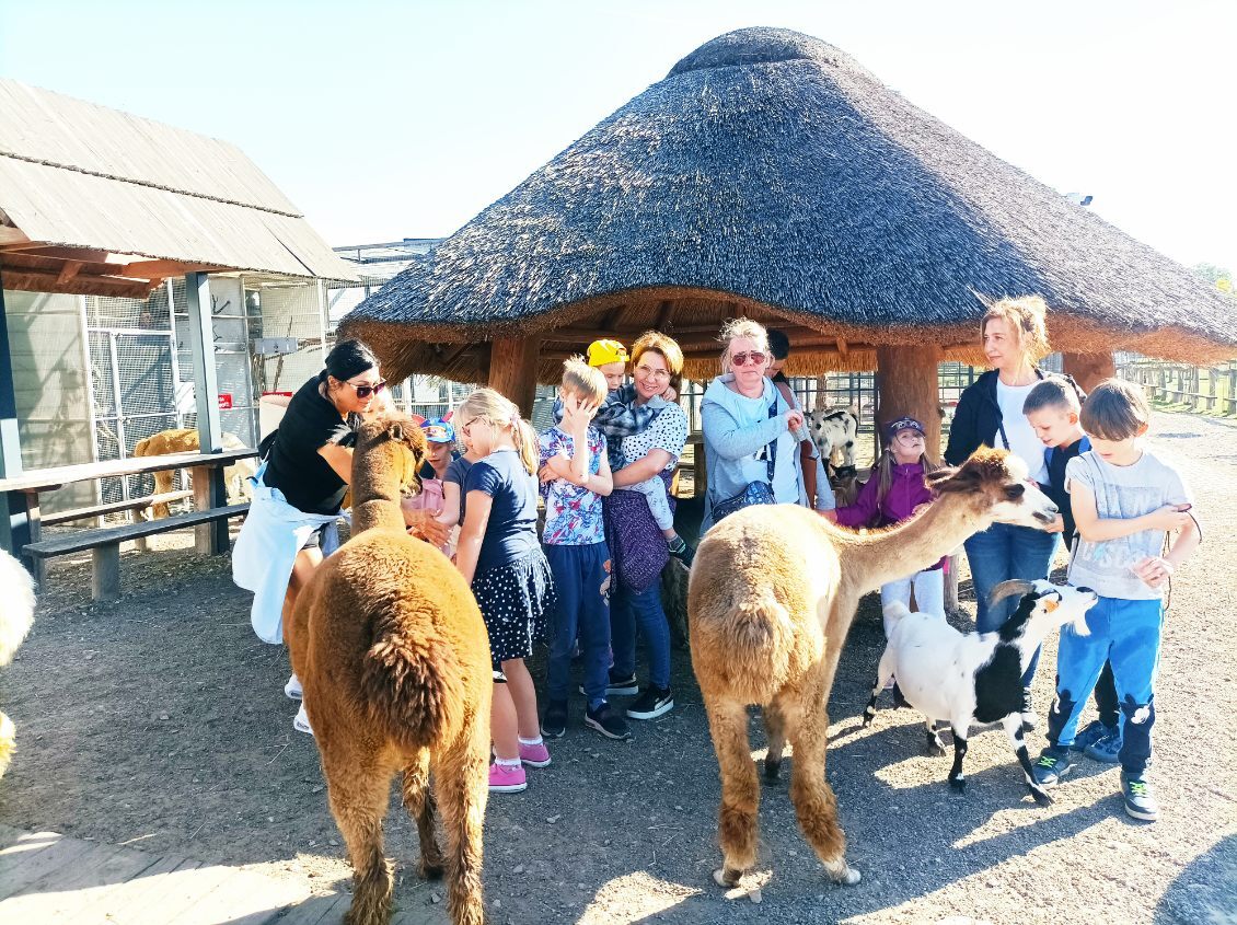 Główną atrakcją były oczywiście alpaki, ale wielbłądy, kozy, zebry, osły, papugi i flamingi również dostarczyły uczniom wiele radości. Dzieci z wielką troską, w poczuciu odpowiedzialności i szacunku karmiły zwierzęta. Zwieńczeniem wyjazdu był pobyt na placu zabaw oraz dietetyczny posiłek serwowany w „rogach obfitości”. Taka też była nasza wycieczka – pełna cudownych przeżyć, głębokich wzruszeń i wielkiej radości.